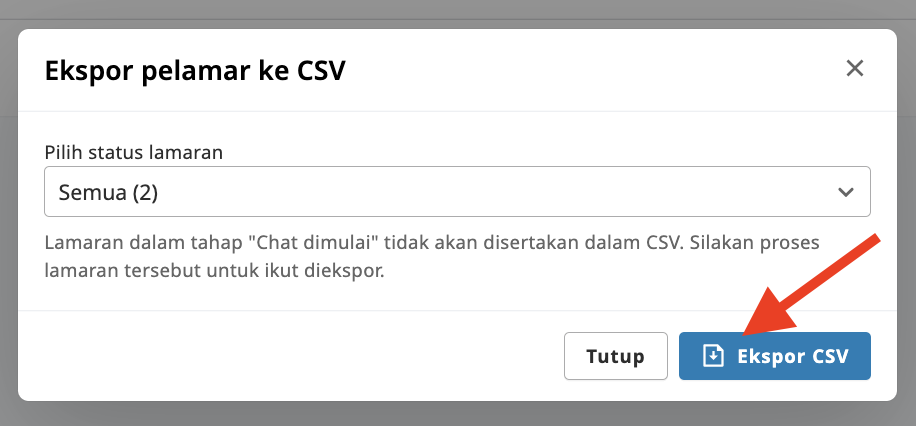 You can choose to download applicants' data based on their application status or select all statuses. Click "Export CSV" to begin downloading your applicants' data.