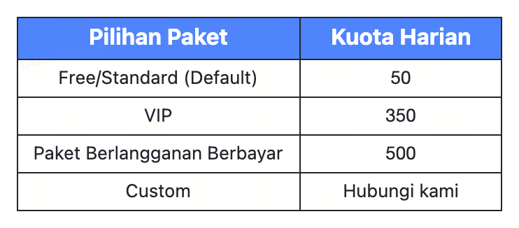 - Upgrade Paket Anda saat ini agar bisa memproses lebih dari batas kuota harian dan bulanan tanpa harus menunggu.